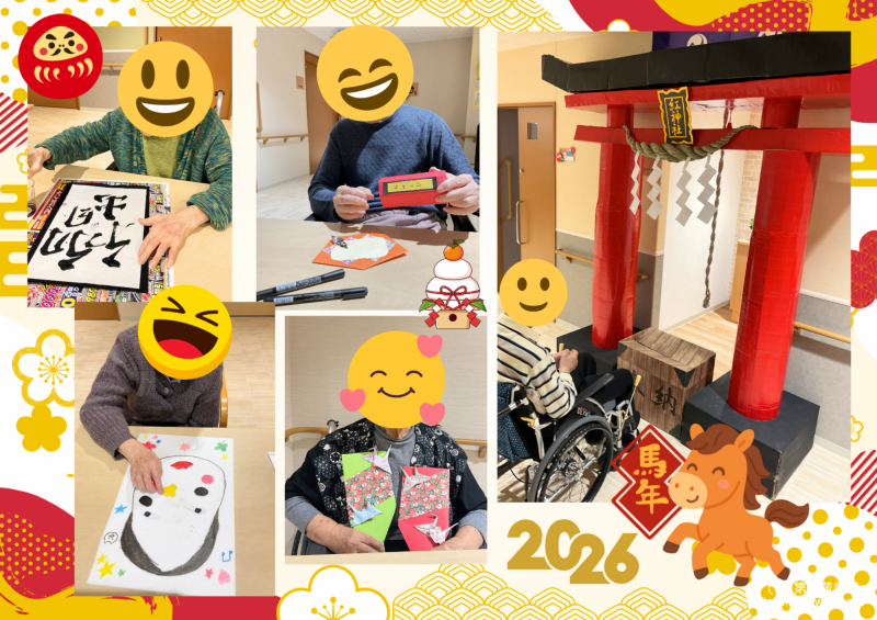今年のお正月は、ユニット内に手作りの鳥居が設置され、 入居者の皆さまが気軽に“初詣”を楽しめるようになりました。